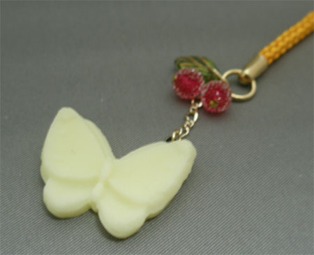 蝶の根付けはシュガービーズをさくらんぼのようにあしらった、和風と洋風が上手くマッチしています。